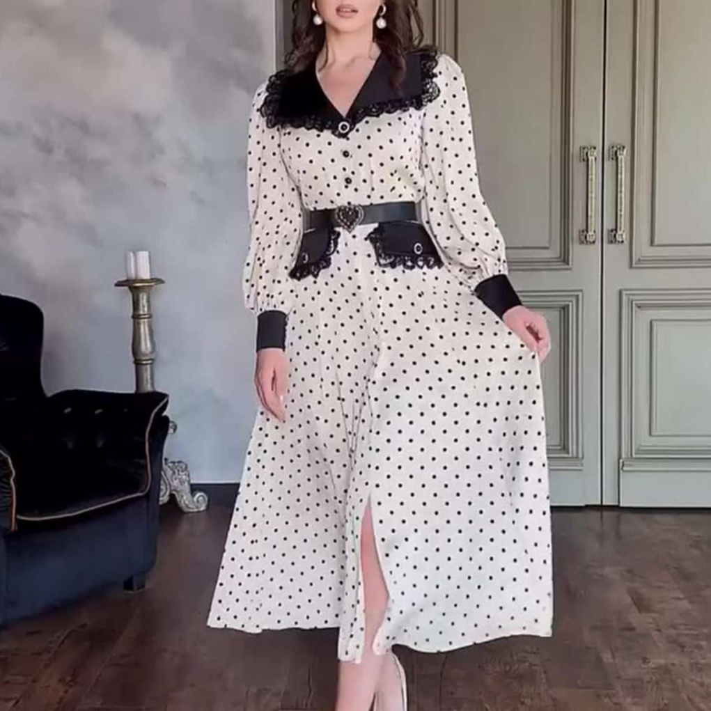 大人かわいい服の定番レトロドット柄ロングワンピース