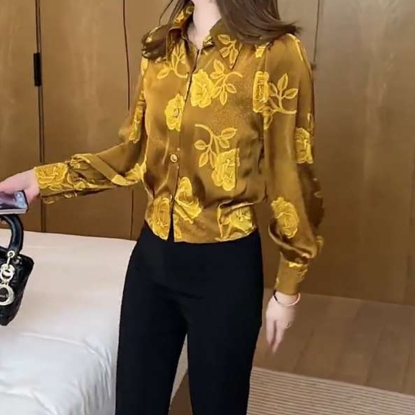鮮やかな黄色の花柄が印象的なシフォンブラウスは、50代の女性におすすめのプチプラアイテムです。
