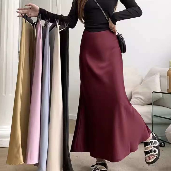深みのあるボルドーカラーが大人の女性の魅力を引き立てる、50代におすすめの大人可愛いマーメイドスカートです。