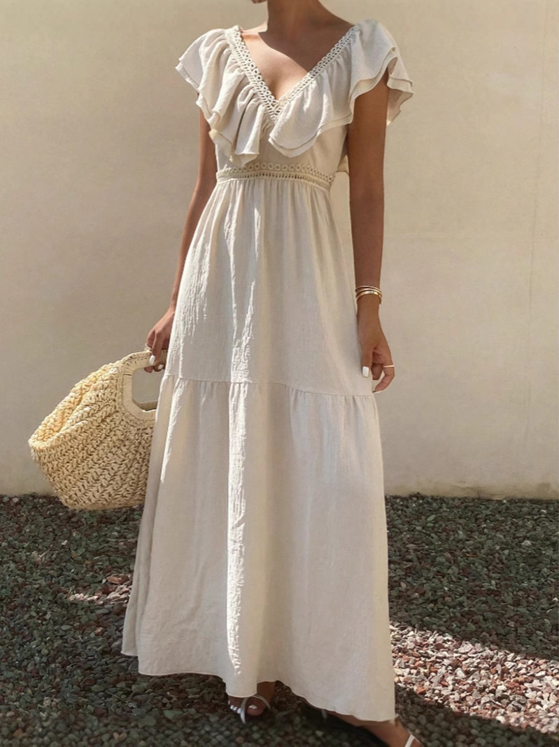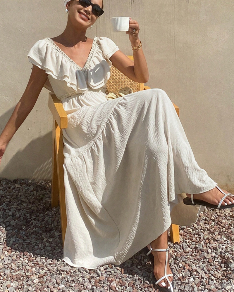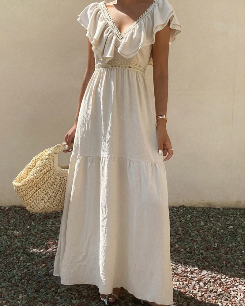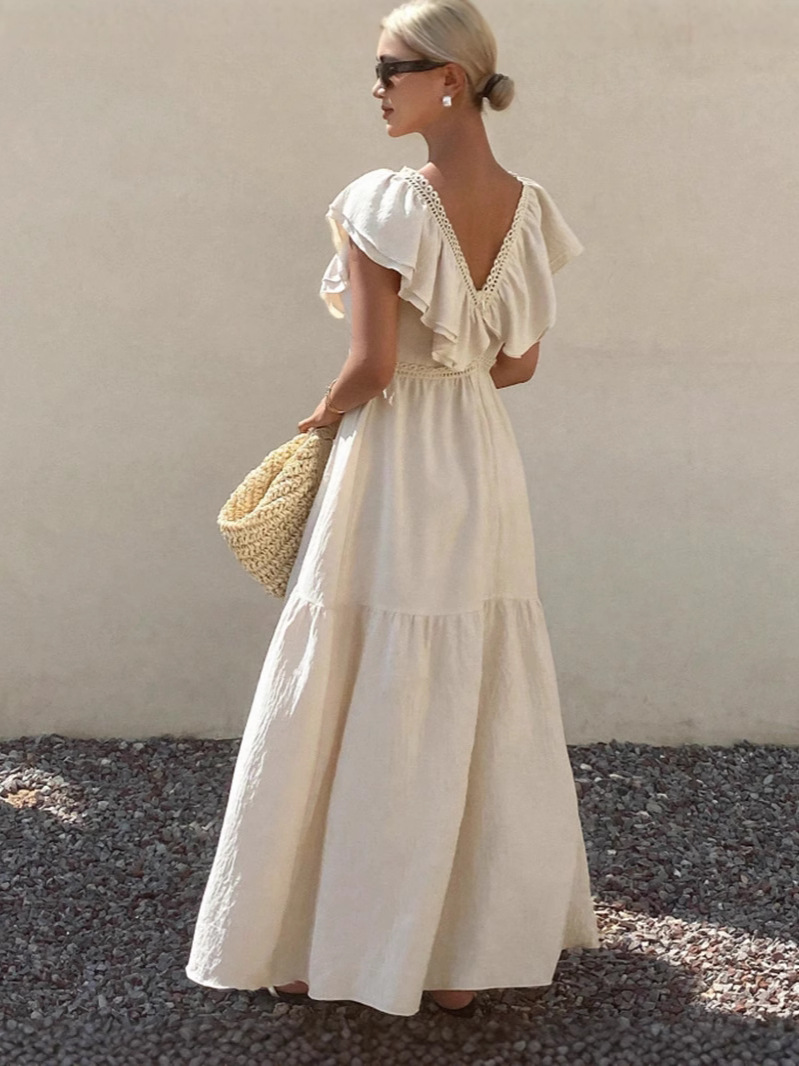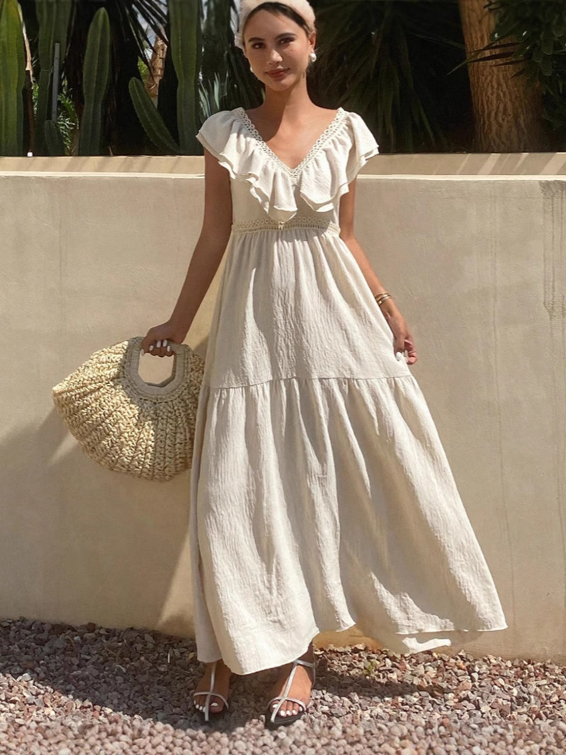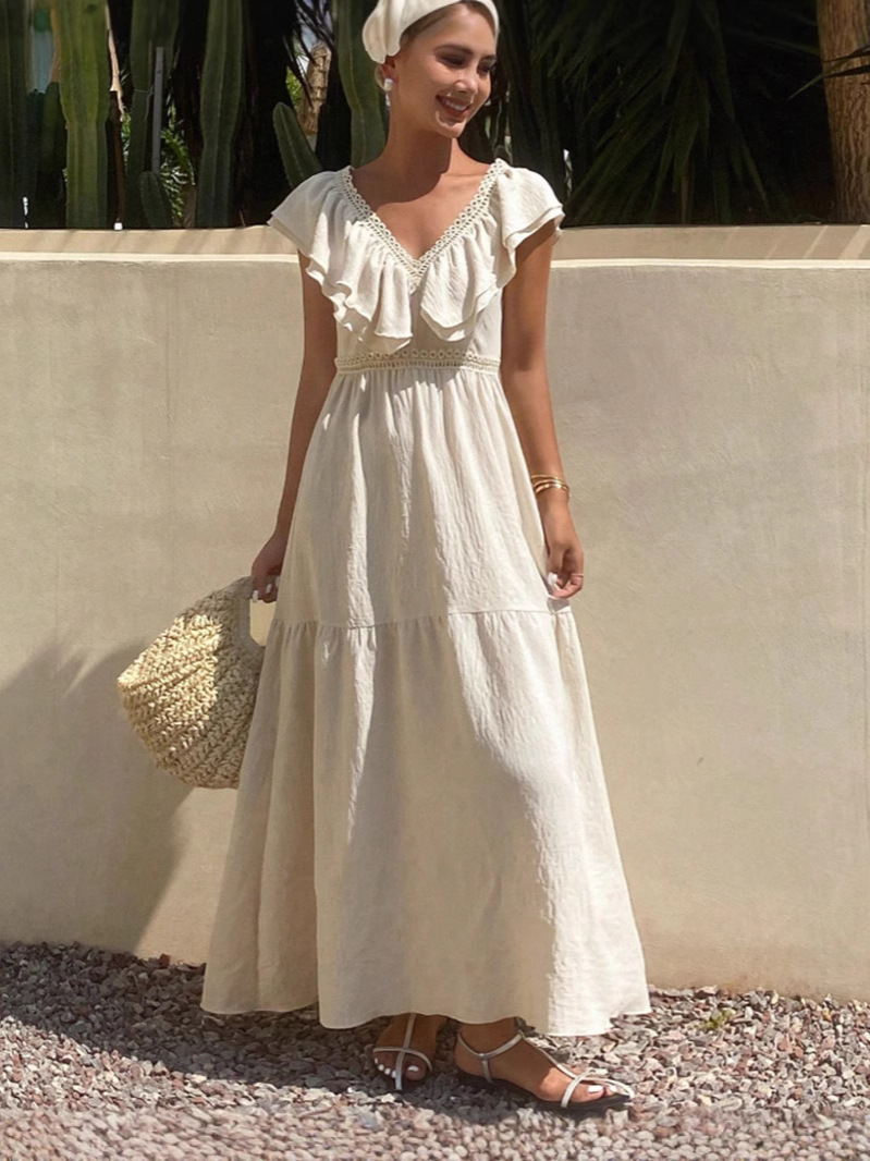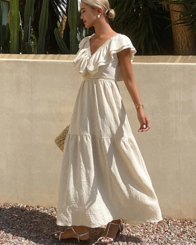 胸元と袖に施されたフリルが女性らしさを演出し、上品で優雅な印象を与えます。