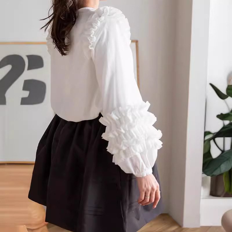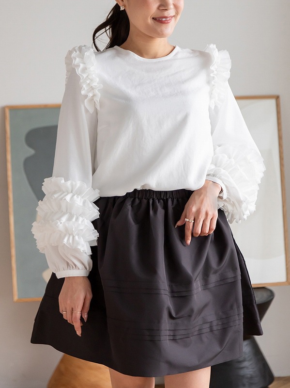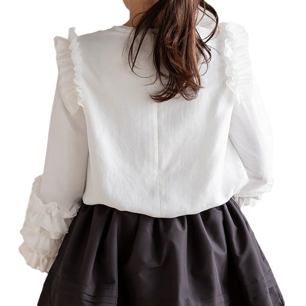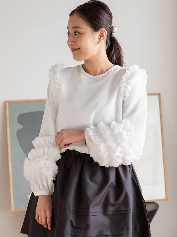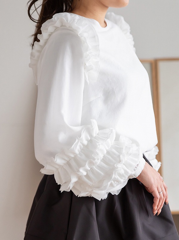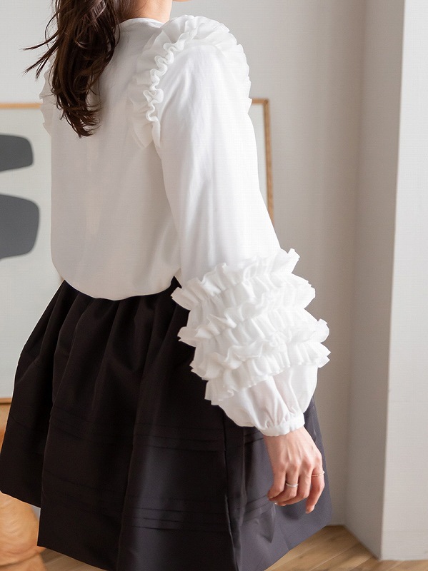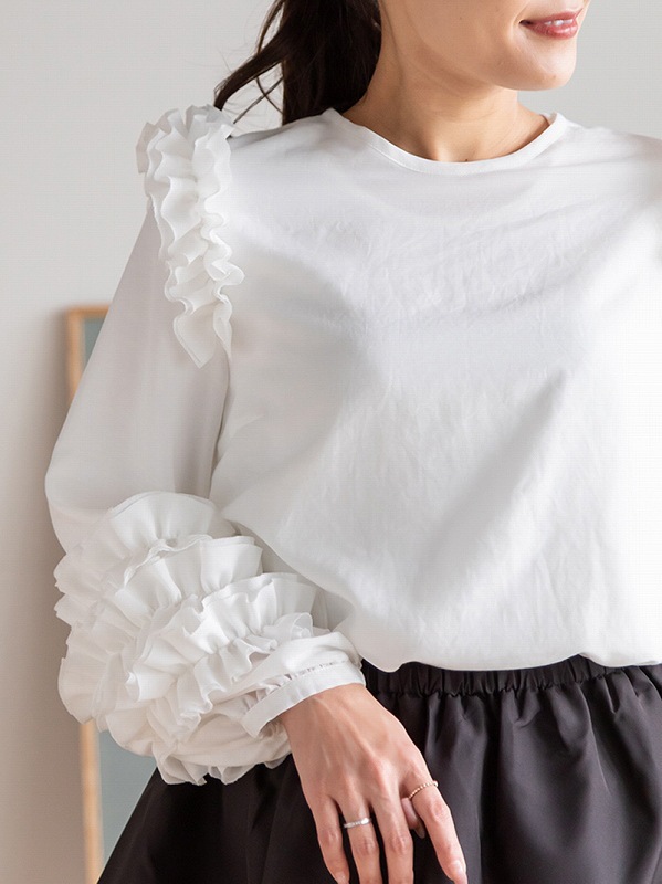 肩から袖口にかけて贅沢に施された立体的なフリルが華やかな印象を与えるブラウスです。