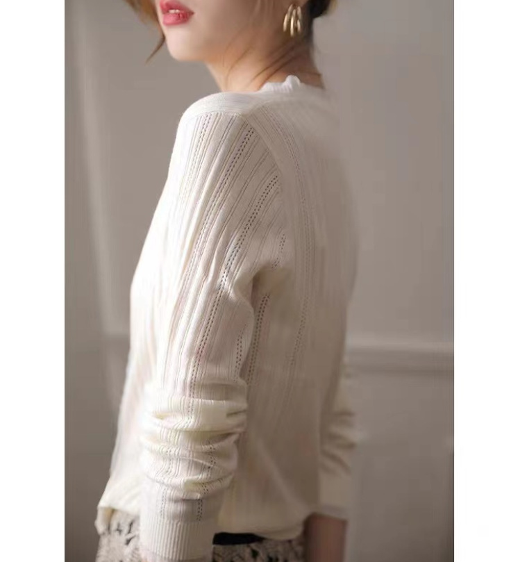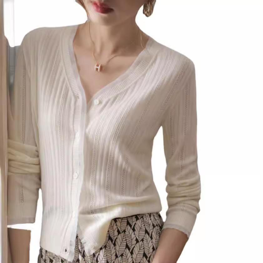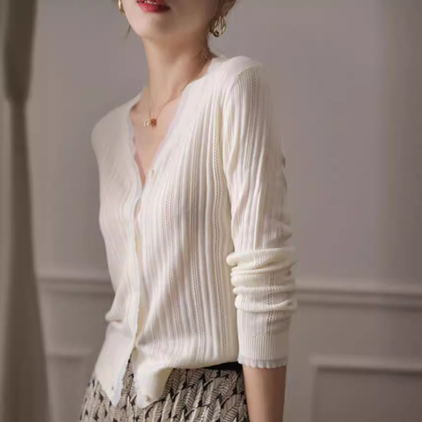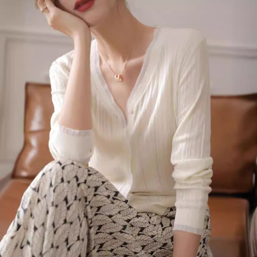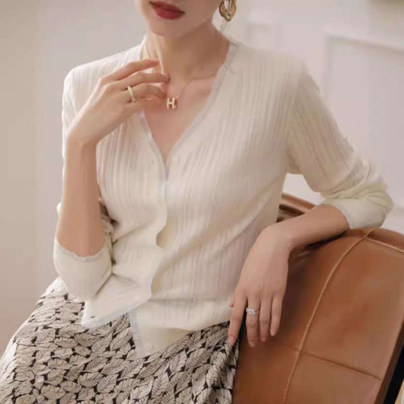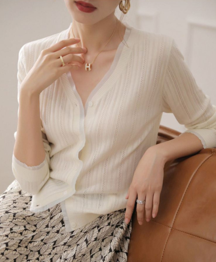 すっきりとしたVネックラインが首元を美しく見せ、前開きデザインで着回し力も抜群