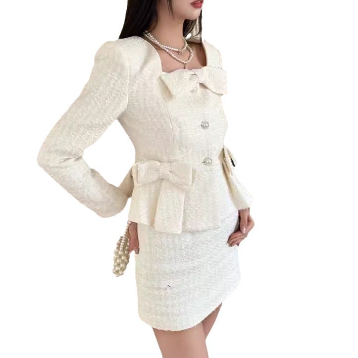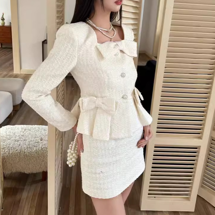 ジャケットは胸元と袖口に愛らしいリボン飾りをあしらい、ウエストを美しく見せるペプラムデザインが特徴的です。