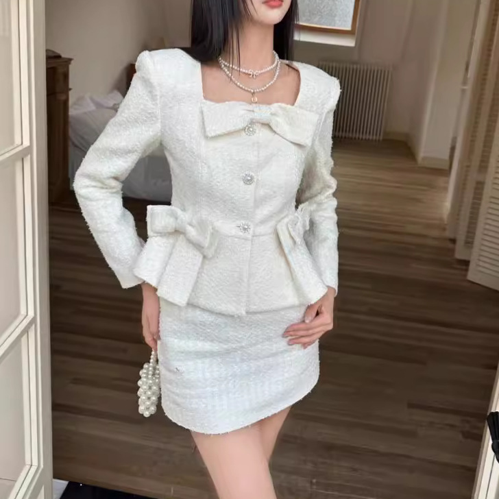 エレガントなツイード素材を使用した大人かわいい服のセットアップです。