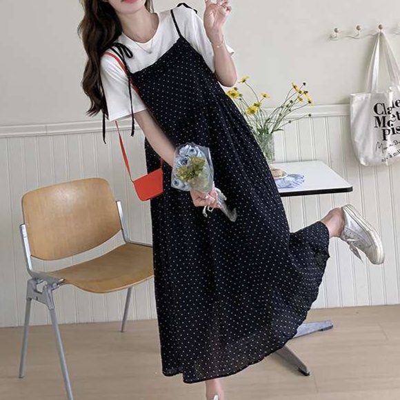 白の半袖Tシャツと重ねたキャミワンピースデザインで、カジュアルながら愛らしい印象に仕上がります。