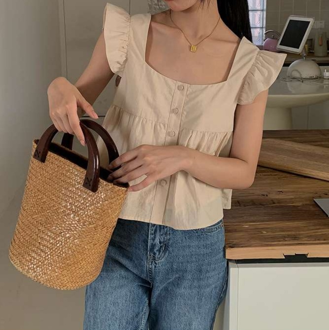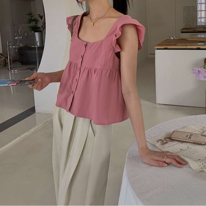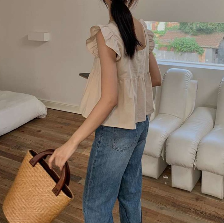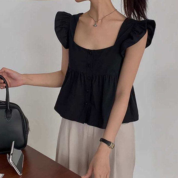 ガーリーなフリル袖とすっきりとしたスクエアネックが、大人かわいい印象を与えるブラウス。