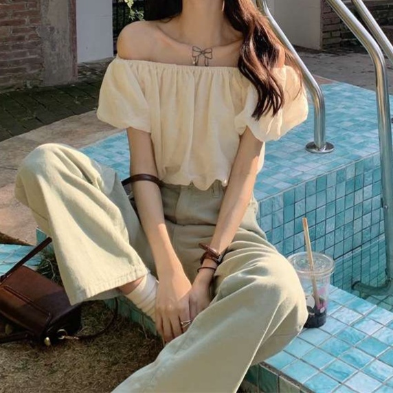 肩元を美しく魅せるオフショルダーデザインに、ふんわりとしたパフスリーブが柔らかな印象をプラス。