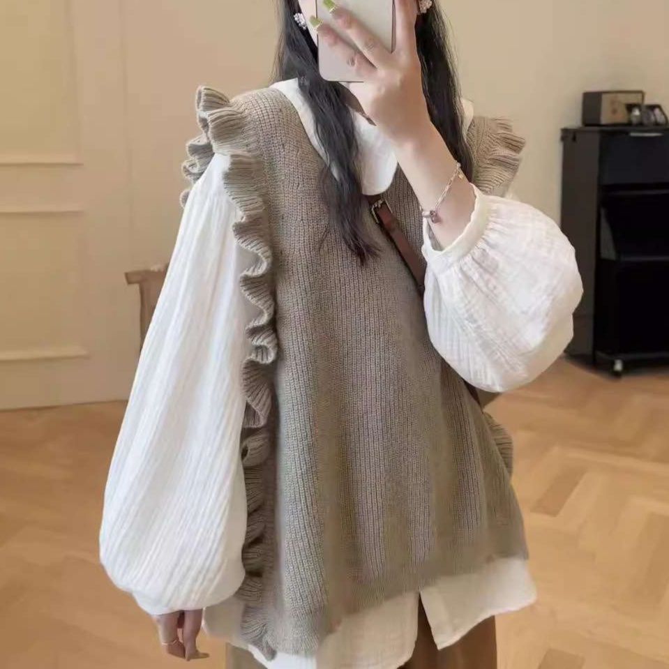 ふんわりとしたフリル襟のシフォンブラウスと、同じくフリルがあしらわれたニットベストの2点セット。