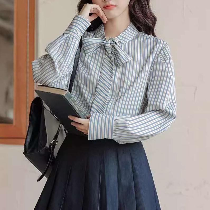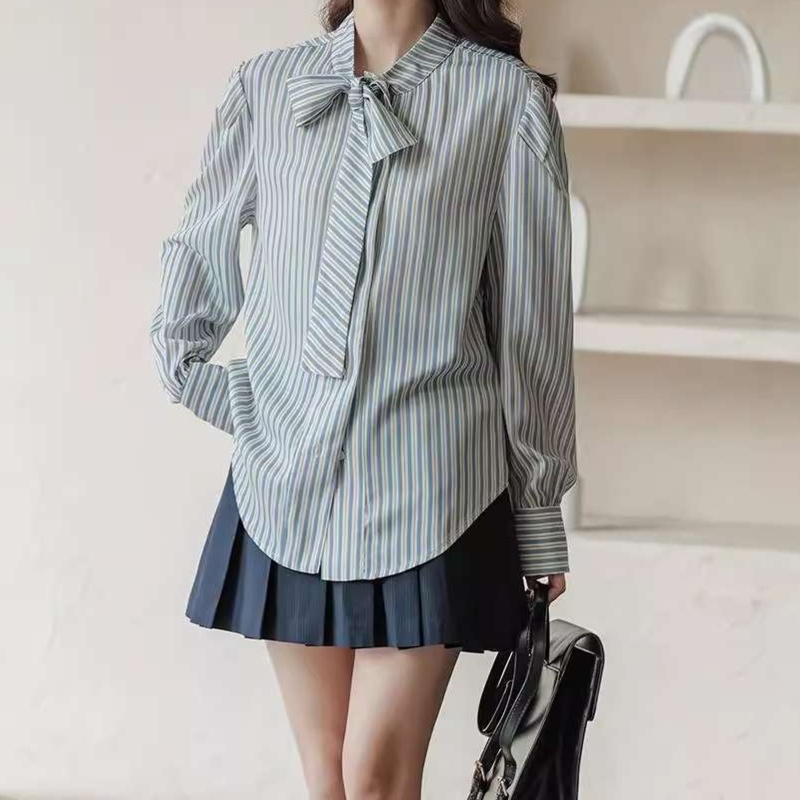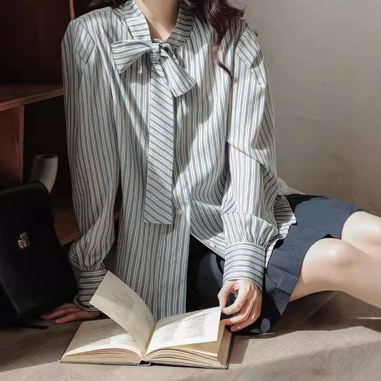 大人かわいい服の代表格トップス。ふんわりとした袖とリボンタイが特徴的な上品なストライプシャツ。