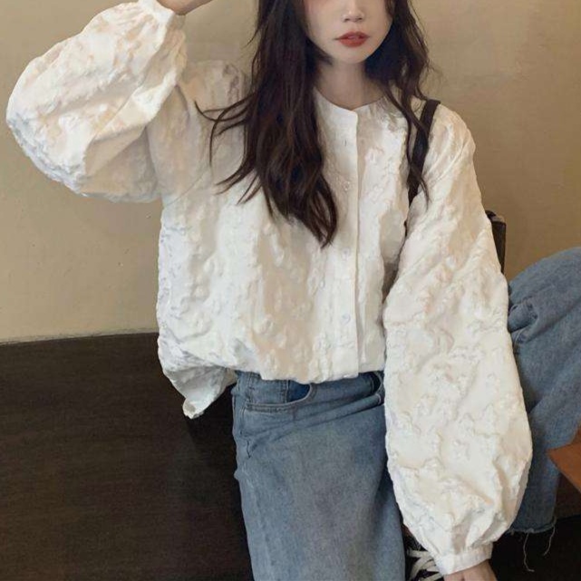 繊細な立体刺繍とふんわり広がるボリュームスリーブが印象的な、大人かわいいデザインのブラウス。