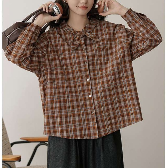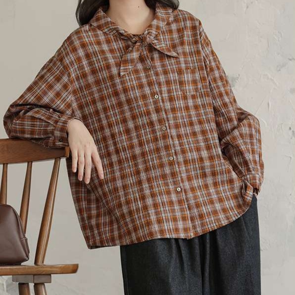 秋冬の季節にぴったりな、大人かわいい雰囲気が漂うリボン付きギンガムチェックシャツです。