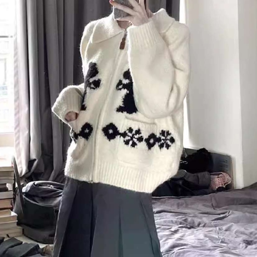 愛らしいリスの刺繍と雪の結晶モチーフがポイントの、大人かわいいニットカーディガン。