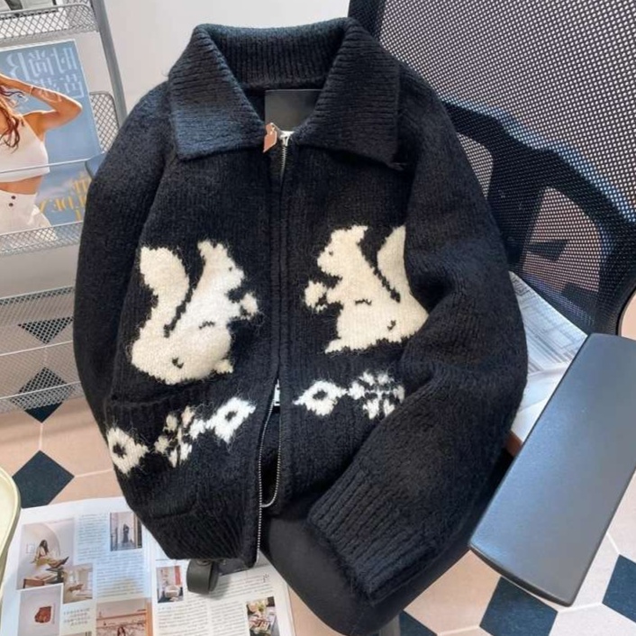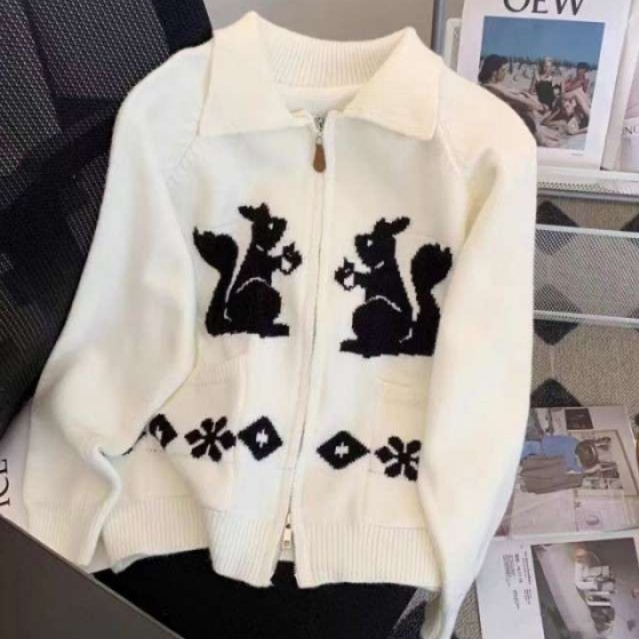 フロントに配置された対称的なリスの刺繍デザインが、愛らしさと遊び心を演出しています。
