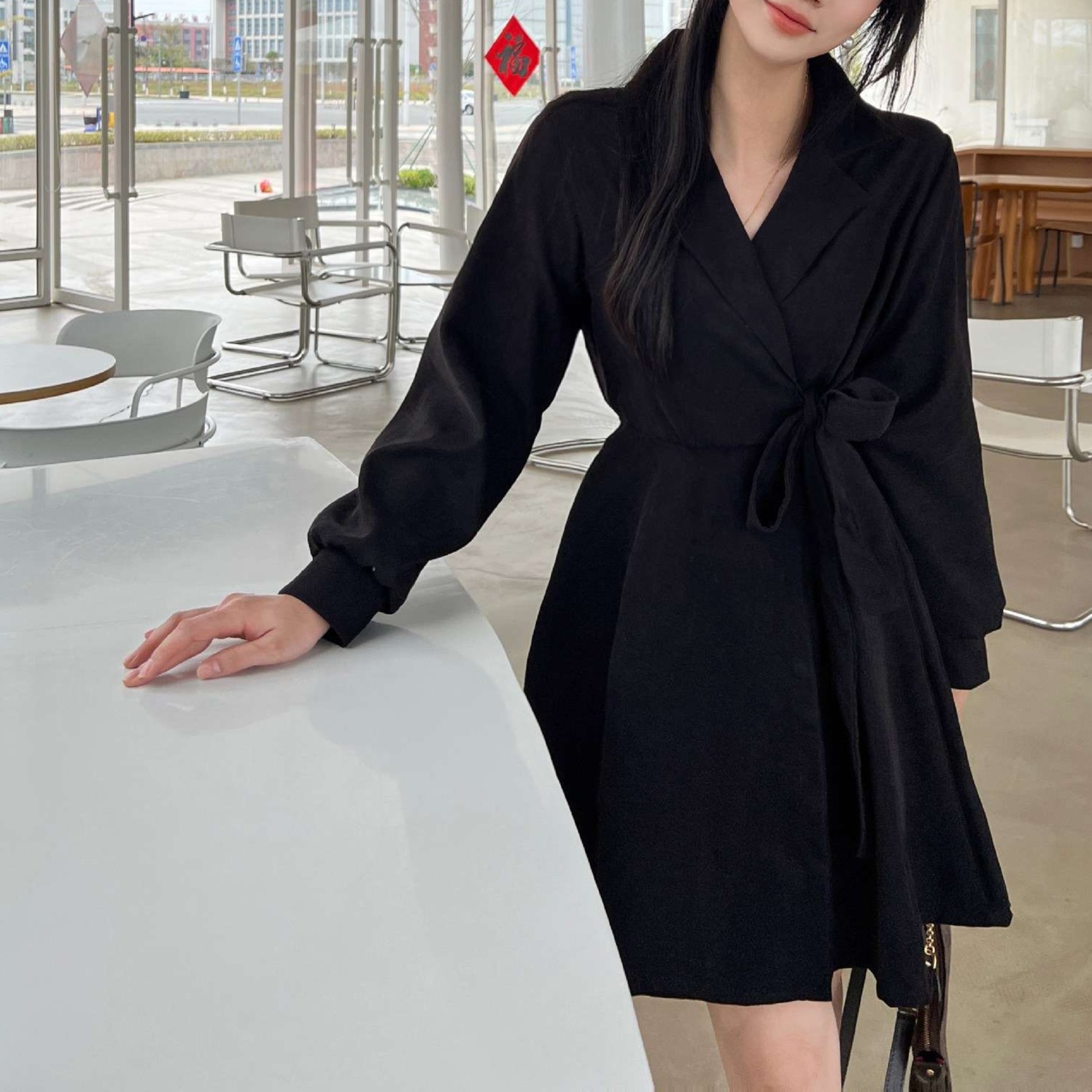ウエストのリボンが女性らしいくびれを美しく演出し、スタイルアップ効果も抜群。
