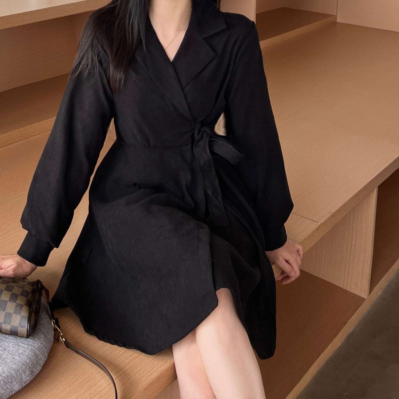 しなやかな素材が身体に優しくフィットし、上品な光沢感が洗練された印象を与えるラップワンピースです。