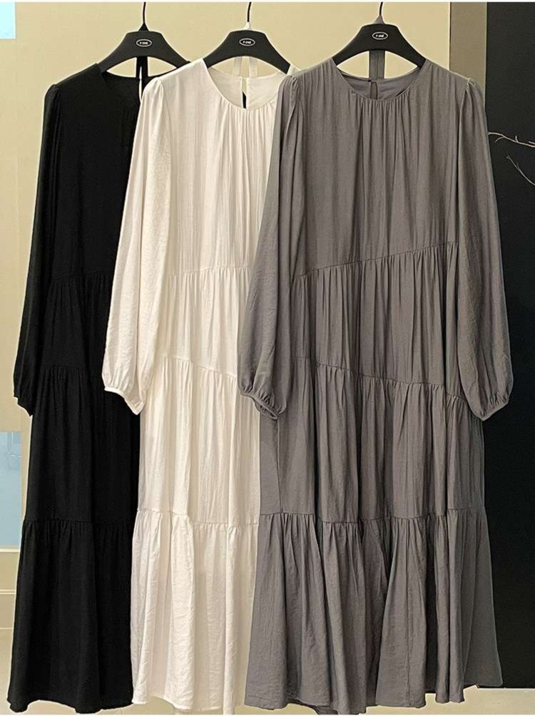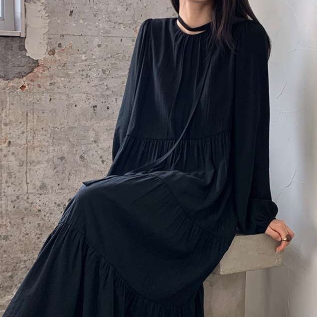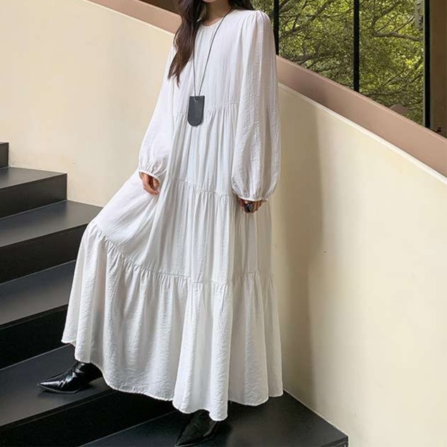 ふんわりと広がるティアードシルエットと、ボリュームのある袖が印象的なロングワンピース。リラックス感のあるゆったりとした着心地ながら、大人の可愛らしさを引き立てます。体型カバー効果もありつつ、動くたびに揺れる裾が女性らしさを演出。1枚で主役になれる、大人かわいいスタイルを叶えるアイテムです。