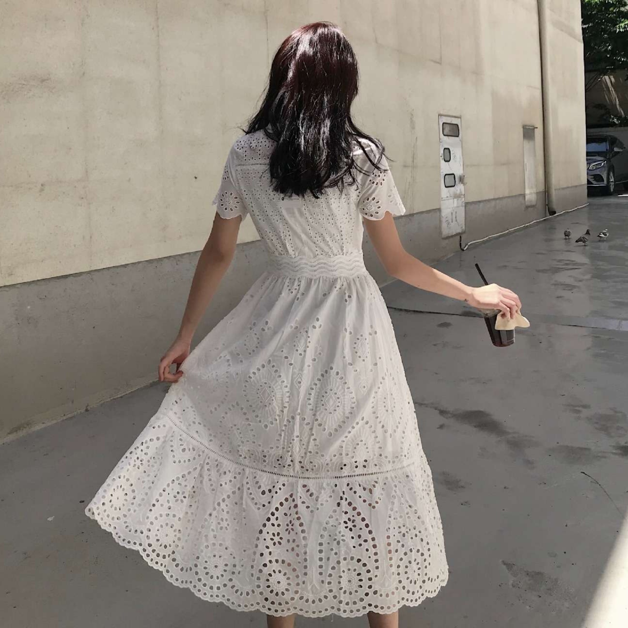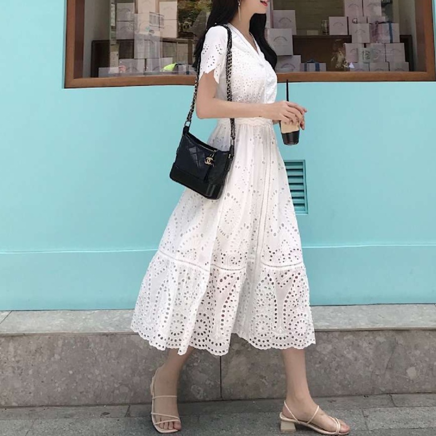 繊細な透かし柄と刺繍レースが印象的な、白の大人かわいいワンピース。