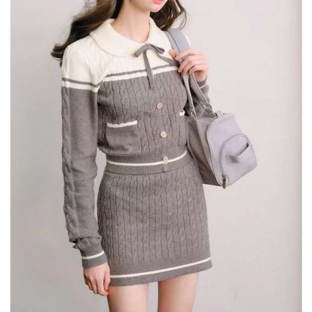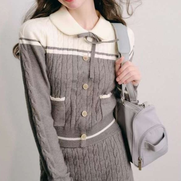上品な襟元に可愛いリボンが映えるニットトップス。ケーブル編みのデザインが高級感を醸し出し、シンプルながらもおしゃれな印象を与えます。スカートとのセットアップで着用可能で、春や秋のコーディネートにぴったり。大人かわいいスタイルを楽しむ一枚です。