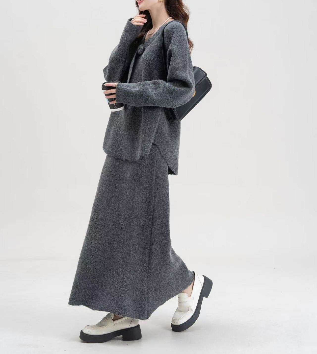 上質なニット素材を使用したセットアップは、優しい肌触りで心地よさを提供。ゆったりとしたシルエットが体型を自然にカバーし、自信を持って着こなせる。胸元のリボンやくるみボタンがさりげなく大人かわいさを演出。普段着として、またちょっとしたお出かけにもぴったりな一着。シンプルながらも洗練されたデザインが魅力です。