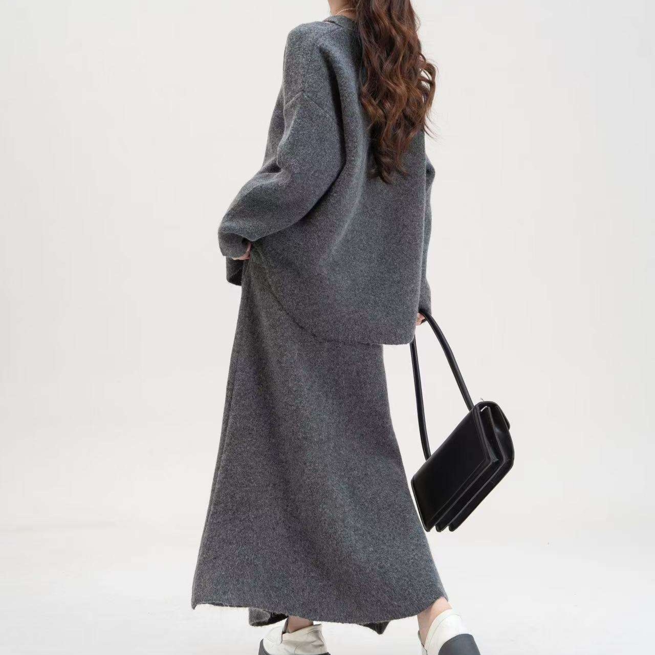 トップスとスカートの素材感を揃えることで、洗練された大人の雰囲気を演出