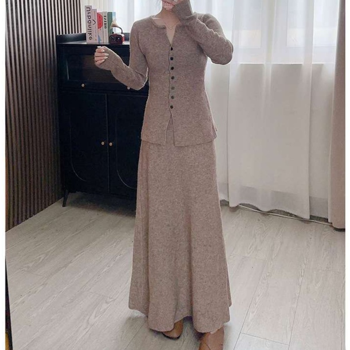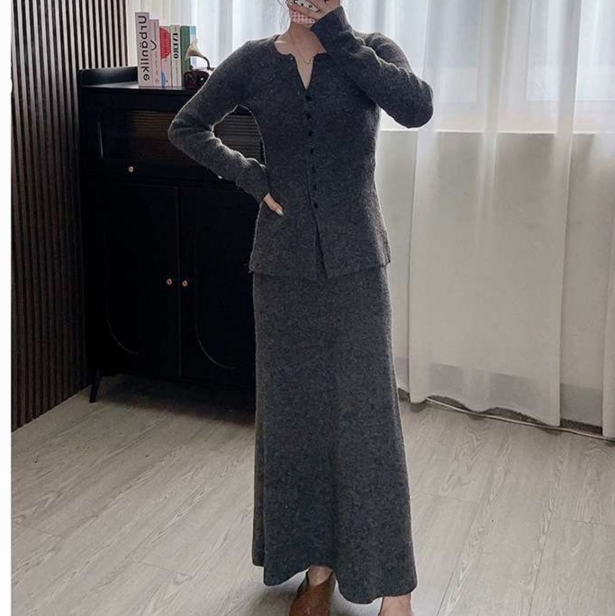 マキシ丈スカートは優雅なドレープを描き、動くたびに上品な存在感を演出します。