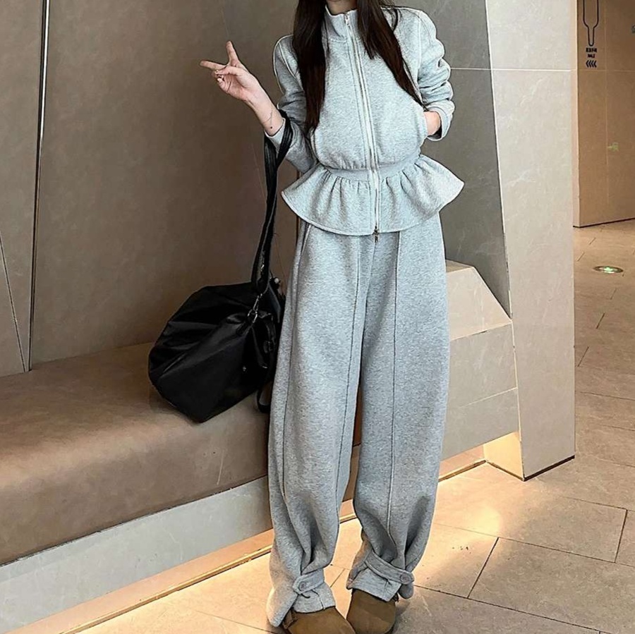 ゆったりとした裾のワイドパンツと、ウエストマークされたトップスの組み合わせで、快適さとおしゃれ感を両立しています。