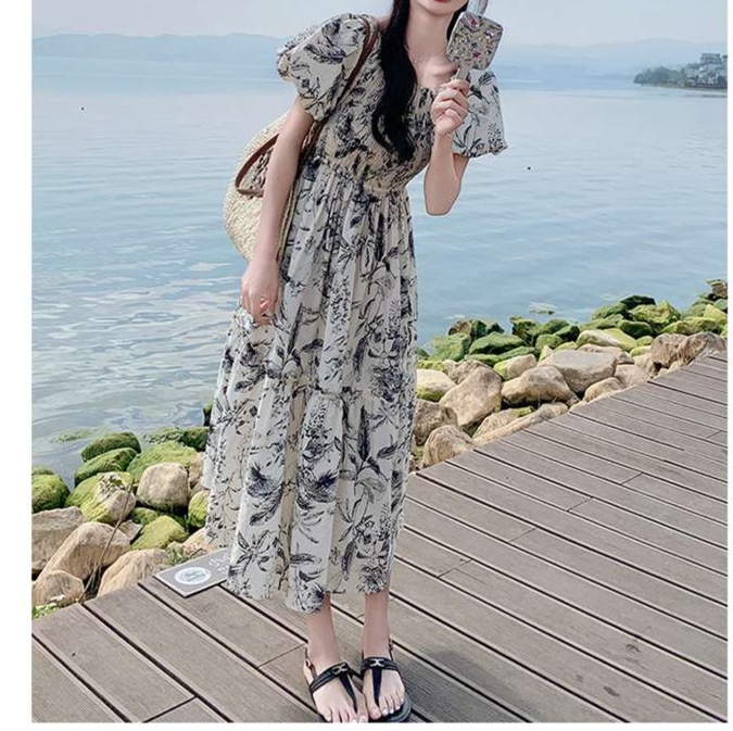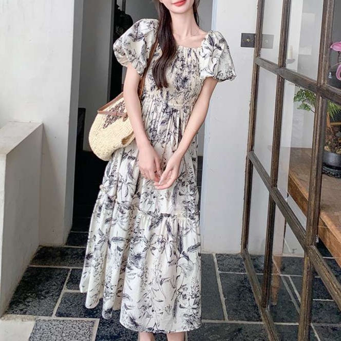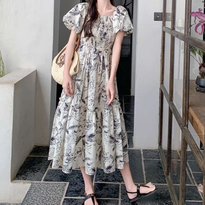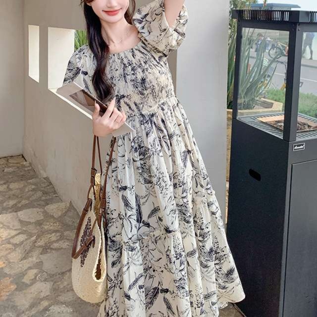 ふんわりとしたパフスリーブと繊細な花柄が、大人かわいい魅力を引き立てるティアードロングワンピース。