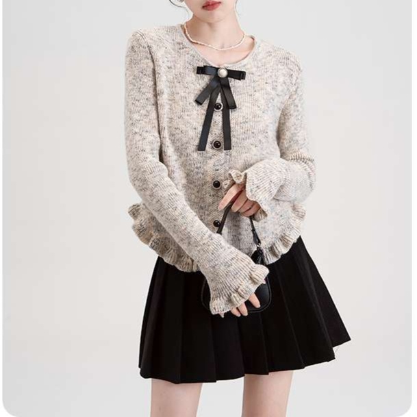 胸元のリボンとパールが、大人かわいい雰囲気を醸し出すトップス。フリル袖と裾のデザインが甘さを添えつつ、洗練された印象を与える女性らしいニットカーディガンです。プリーツスカートとの相性も抜群で、清楚で上品なスタイルが楽しめます。普段使いから特別な日まで、幅広く活躍する一着です。あなたの魅力を引き立てるアイテムとして、ぜひワードローブに加えてください。