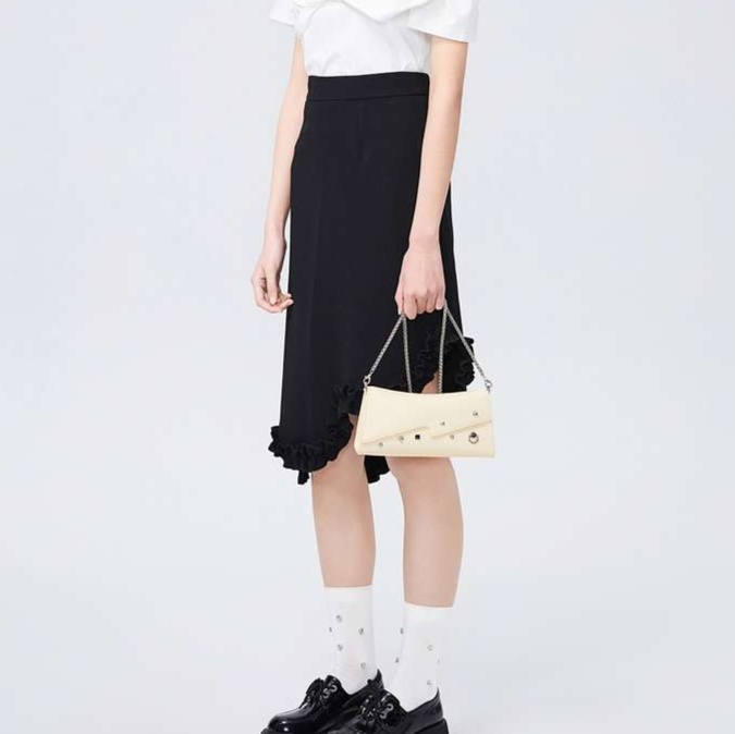 動きのある裾ラインと繊細なフリルが魅力の、大人かわいいアシンメトリースカート。