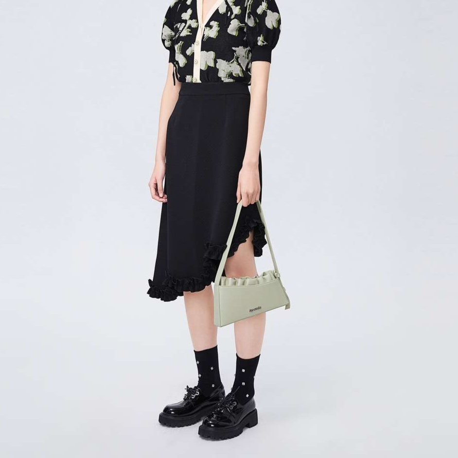 裾のフリルデザインが甘くなり過ぎず、大人っぽさと可愛らしさのバランスが取れています。
