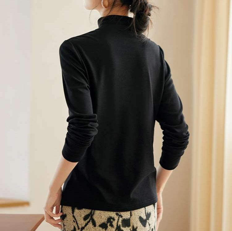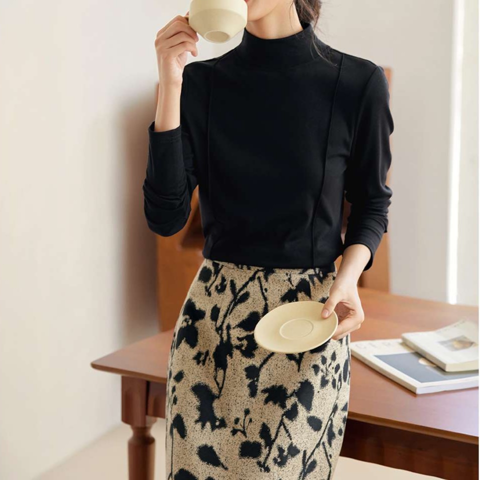 上品な印象を与えるモックネックデザインで、知的で洗練された雰囲気を演出します。