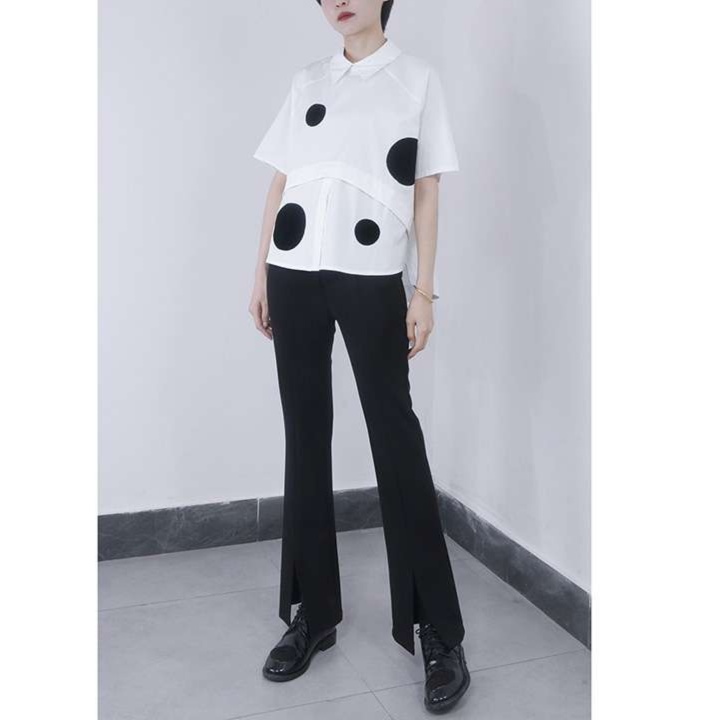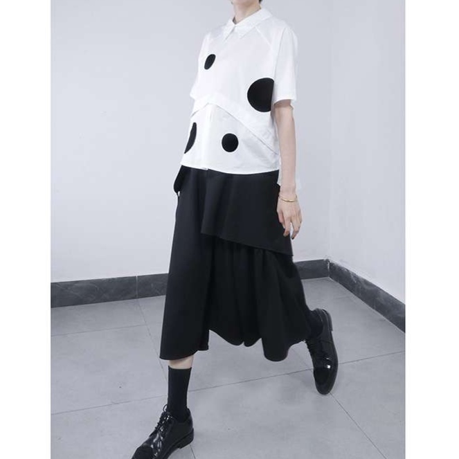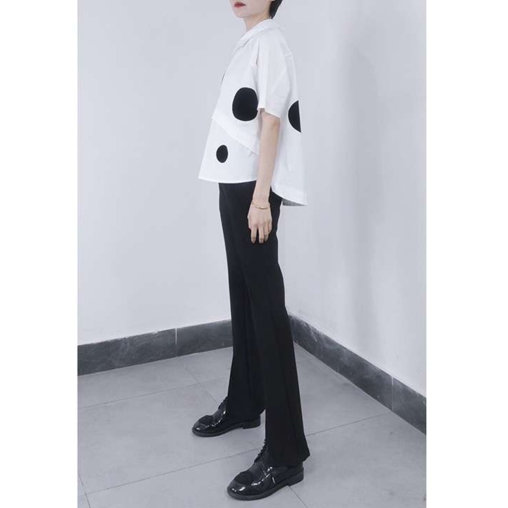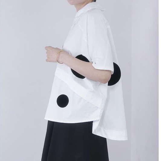 大きめの水玉模様が遊び心を添える、大人かわいい襟付きゆったりブラウス。