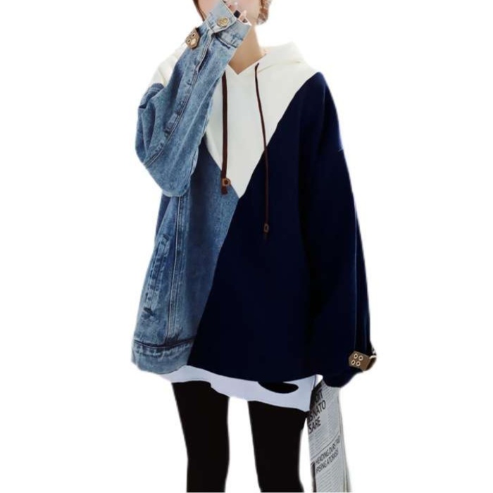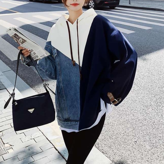 スポーティーな素材とデニムを組み合わせたユニークなデザインで、カジュアルながら個性的な印象を演出