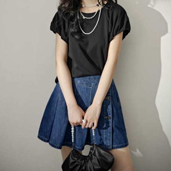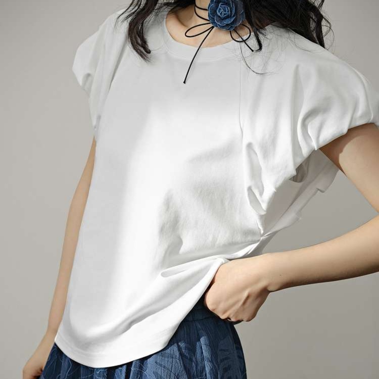 ふんわりとしたパフスリーブが大人かわいい印象を与える半袖プルオーバー。