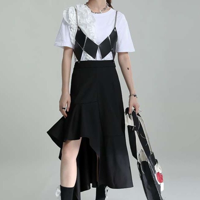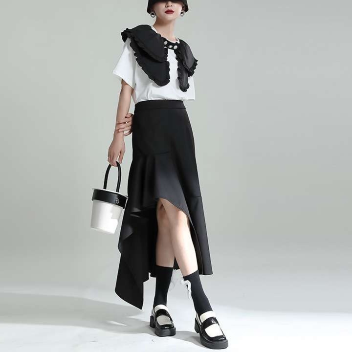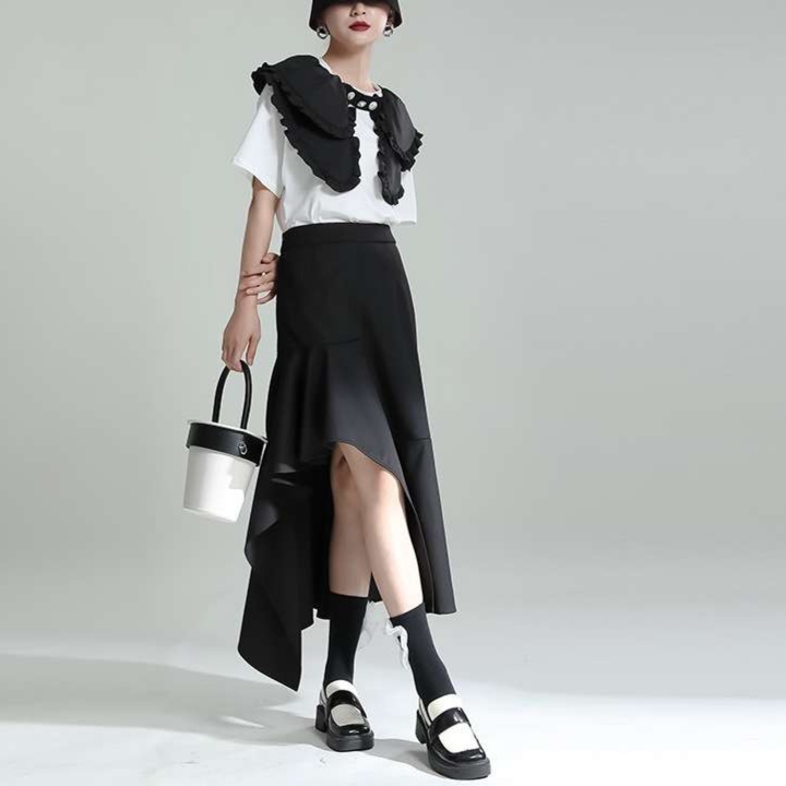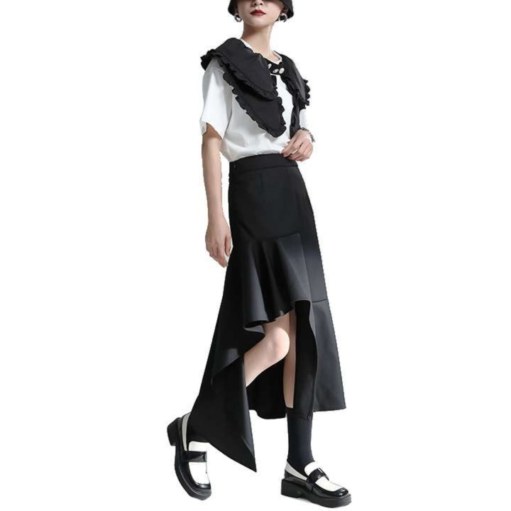 不規則な裾の切り替えとフリルデザインが、モダンでアーティスティックな雰囲気を演出します。