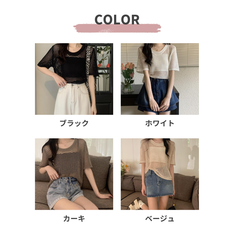 透け感のある編み目デザインが、こなれた夏らしい雰囲気を演出